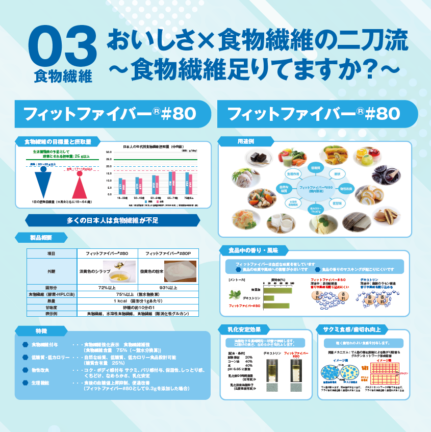 食品開発展2024 東京ビッグサイト西1・2・4 ホール&アトリウム2024年10月23日(水)〜25日(金)10:00〜17:00 展示内容Contents 詳しく見る 味質改良 中味向上に最適なオリゴ糖 日食マイルドオリゴ 主成分:α-1,6結合分岐オリゴ糖(重合度4-6の糖質を高含有) 味質:風味を損なわず自然でマイルドな味質(甘味度約25%) 詳しく見る 味質改良 苦みのあるオリゴ糖 日食ゲントース#45 糖質には珍しいキレの良い苦味を有するゲンチオオリゴ糖を含むグルコオリゴ糖です。苦味付与効果のほか、隠し味として用いることで果汁感増強効果や渋味低減効果などを有します。 詳しく見る 食感改良 陳列、レンジ加熱後もサクサクに! 日食テクスターチ#01 揚げ物衣の食感改良を目的としたタピオカ加工でん粉です。 常温陳列時やレンジ加熱後も良好な食感を維持します。 衣の食感をサクサクとしたひきのない食感にします。 詳しく見る ここにもある!日本食品化工 日本食品化工の製品は日々の食卓で活躍しています。 お問い合わせ