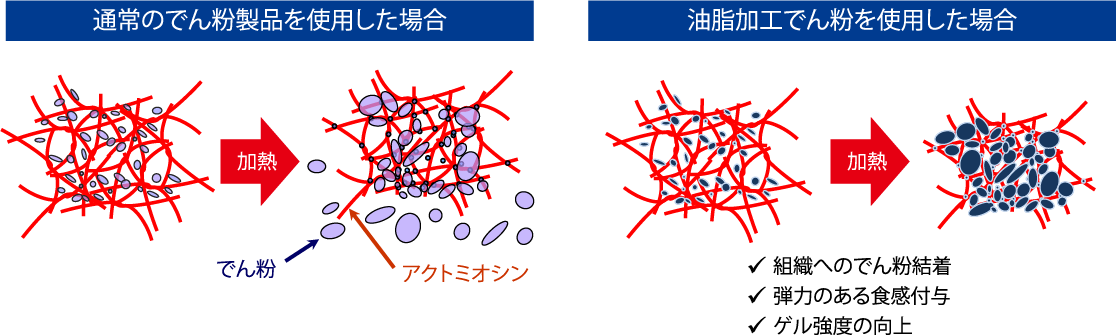 たんぱく質との結着性を向上することでゲル強度を向上、練り製品の弾力や硬さUP、中種とフライ衣の結着性向上に寄与します。