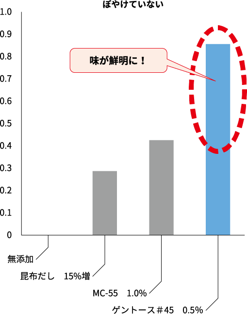 | ④ゲントース#45 0.5% | 昆布らしい余韻が出る。全体的に味が濃くなる。トップのインパクトあり。 |